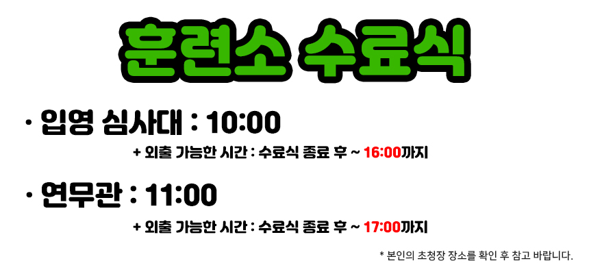 논산훈련소 수료식은 보통 30분 내외로 진행되고 입영 심사대와 연무관이 시간대가 서로 다르니 밑에 사진을 첨부해보았으니 참고해주시면 좋을 것 같습니다!