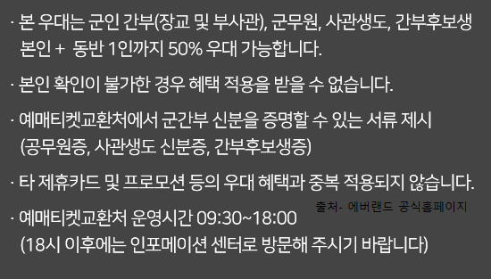 본인 + 동반 1인까지 할인이 적용되며 군인 간부 (장교 및 부사관), 군무원, 사관생도, 간부후보생이 해당이 됩니다!