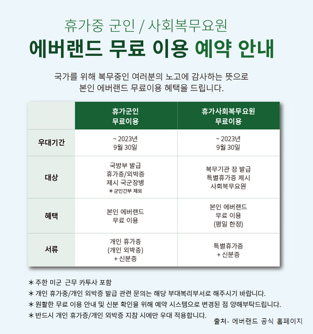 기간은 이번 2023년 9월 30일까지이며 휴가 중인 군인 분들은 휴가 기간 중 1회 본인에 한 하여 이용이 무료로 가능하다고 하니 휴가 나오신 기념으로 에버랜드 가보시는 건 어떨까요?