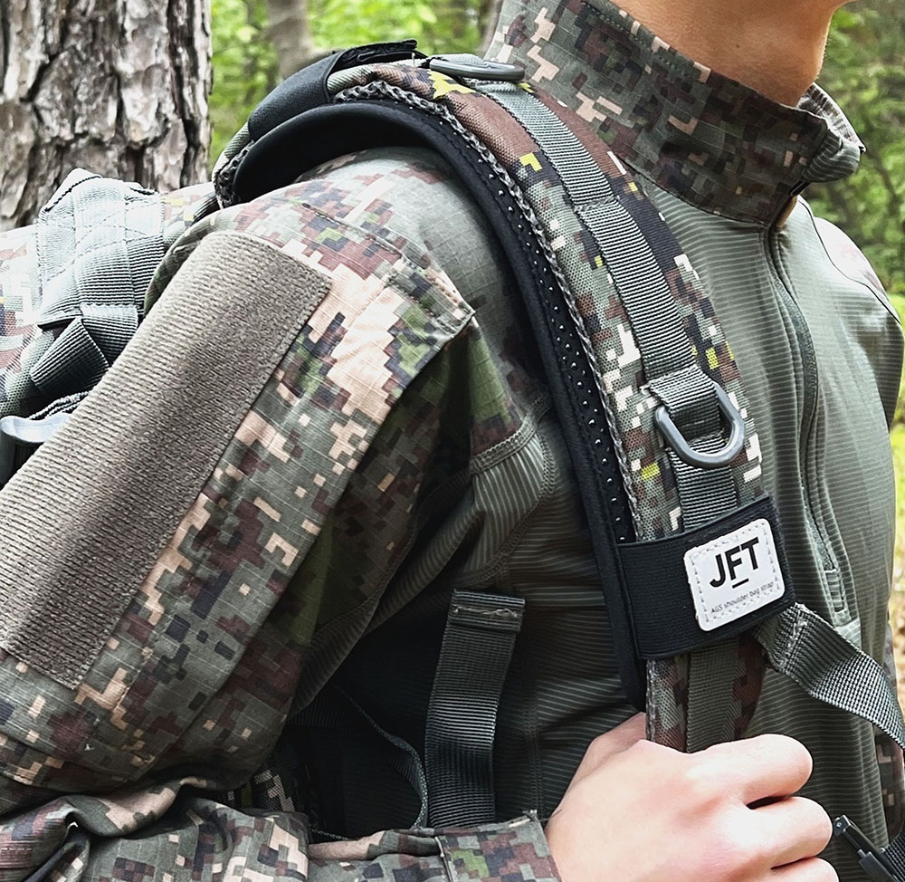 군장 같은 경우에는 20~40kg 정도 되는 무게이기 때문에 군인분들의 어깨에 부담이 갈 수 밖에 없는데 부담을 덜어줄 수 있는 어깨 보호대를 사용함으로써 부담을 덜을 수 있습니다!