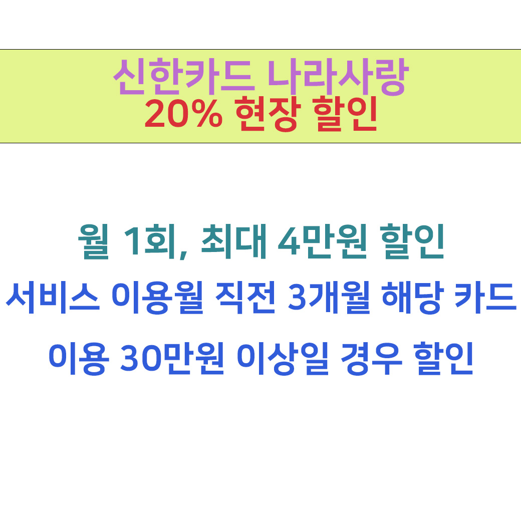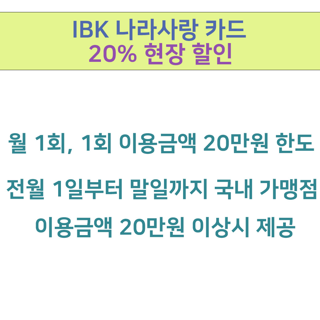 위에 사진 참고해주시면 기업은행 나라사랑카드 같은 경우에는 월 1회, 1회 이용금액은 20만원 한도이며 월 최대 4만원 할인 가능합니다!